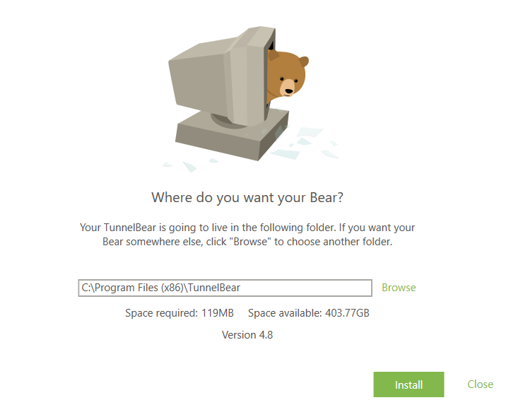 터널베어 VPN 설치 파일을 클릭해서 설치할 곳을 선택한 후에 하단의 'Install' 버튼을 클릭합니다.