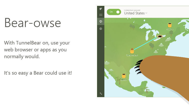 터널베어 VPN은 지도 화면에서 원하는 국가를 바로 선택할 수 있도록 직관적으로 화면을 구성하고 있습니다.
