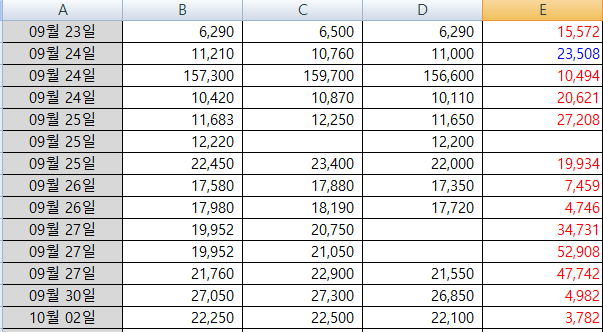 값이 입력되지 않은 셀은 흰 배경이 그대로 남아 있습니다. 필요에 따라 배경색을 구분해 놓으면 필요한 데이터를 빨리 찾는데 도움이 될 것입니다.