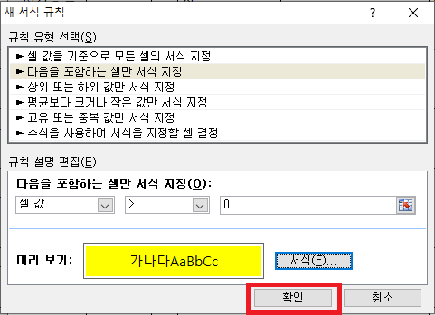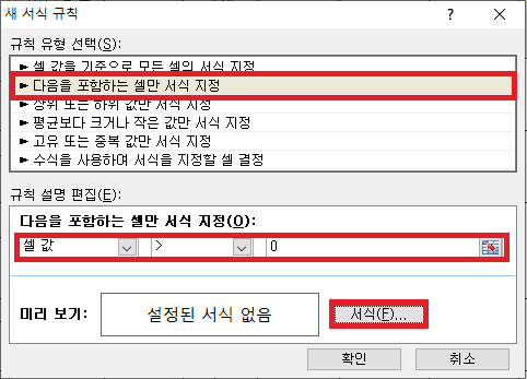그러면 [새 서식 규칙] 대화상자가 나오는데 여기서는 양수 값에 배경색을 넣을 생각이기 때문에 "다음을 포함하는 셀만 서식 지정"을 선택하고 [셀 값], [>], [0]을 지정합니다.