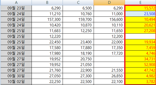위와 같은 절차로 0보다 큰 값이 입력된 셀에는 노란 배경이, 0보다 작은 값이 입력된 셀에는 푸른 배경이 입력되도록 한 결과입니다.