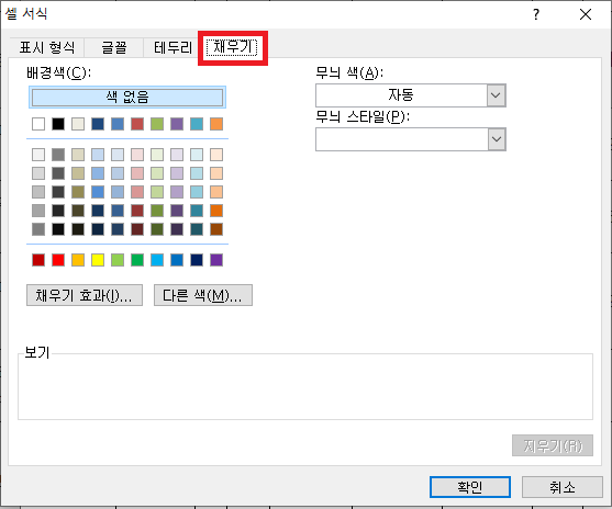 [채우기] 탭에서 원하는 색을 선택하고 확을 버튼을 누르면 아래 대화상자처럼 미리 보기가 가능합니다.